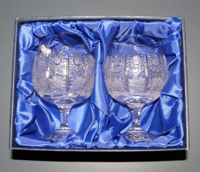 Skleničky na koňak jsou ručně broušené z pravého českého křišťálu min. 24 % PbO. Luxusně baleny v modrém saténu s nápisem BOHEMIA CRYSTAL. Balení obsahuje 2 ks. Brus PK-pětistovka.