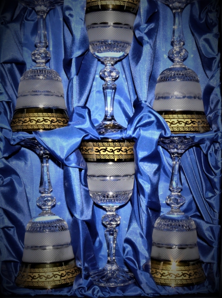 Luxusní ručně broušené skleničky na bílé víno zdobené zlatem jsou vyrobeny z pravého českého křišťálu min. 24% PbO. Baleno po 6 kusech v modrém saténu s nápisem BOHEMIA CRYSTAL.