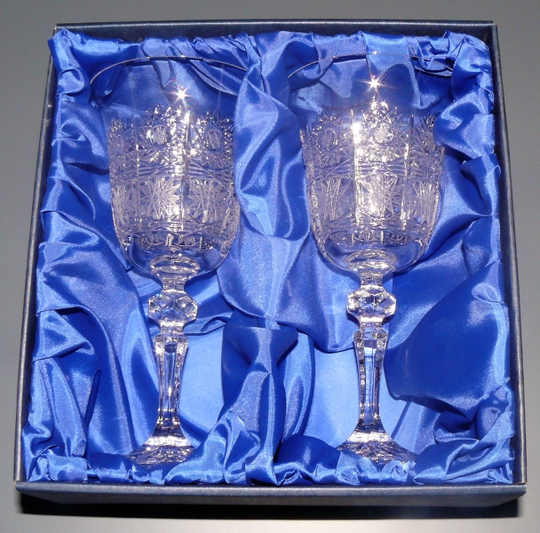 Ručně broušené skleničky na červené víno z pravého českého křišťálu min. 24% PbO. Baleno v modrém saténu po 2 ks s nápisem BOHEMIA CRYSTAL.