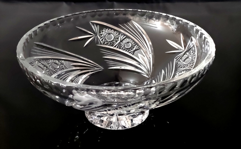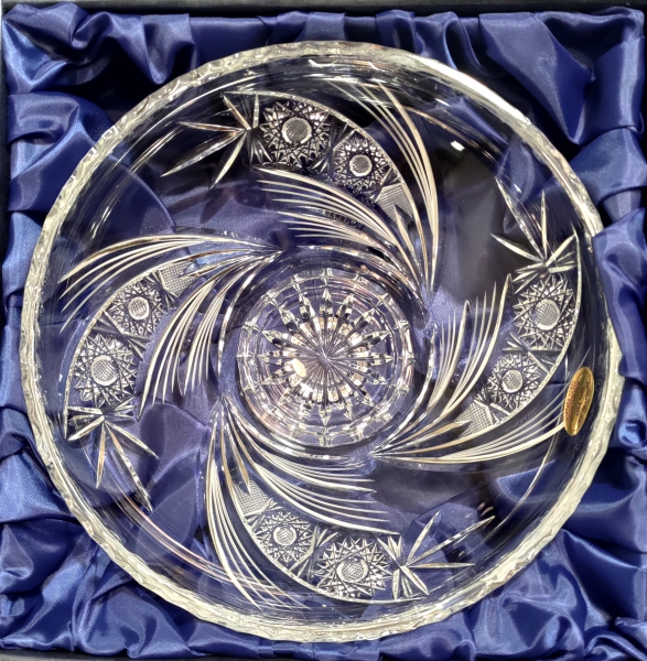 Krásná ručně broušená a foukaná mísa z pravého českého křišťálu min. 24% PbO. Brus KOM- kometa, velice oblíbený moderní dekor. Baleno v modrém saténu s nápisem BOHEMIA CRYSTAL.