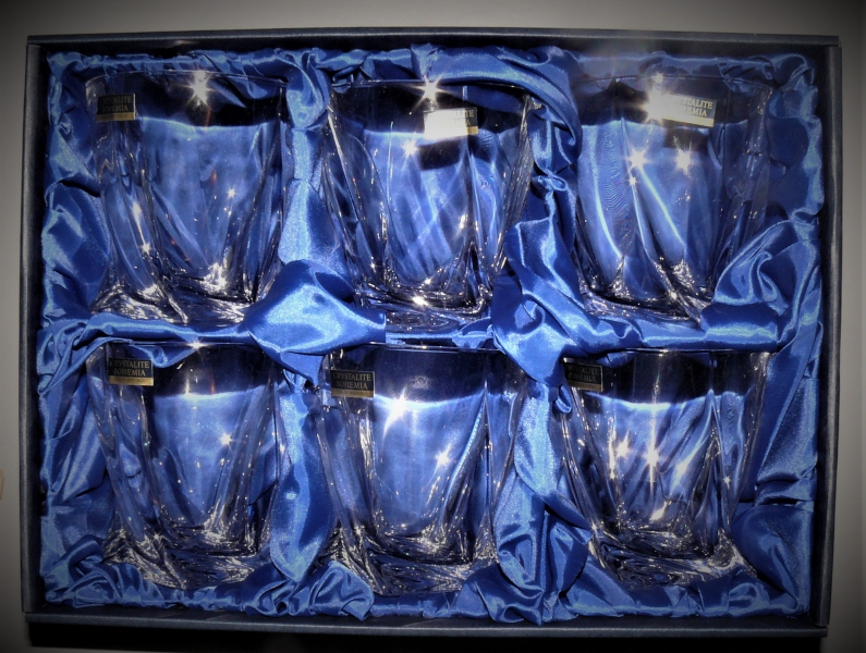 Sklenice na whisky z bezolovnatého křišťálového skla crystalite. Objem 340 ml. Baleno v modré dárkové krabičce se saténem po 6 ks.